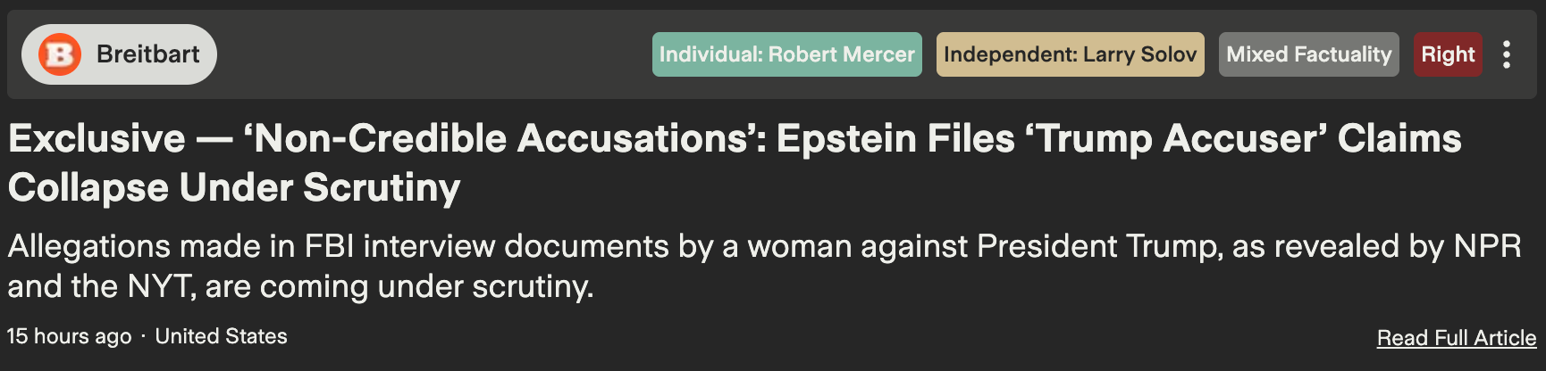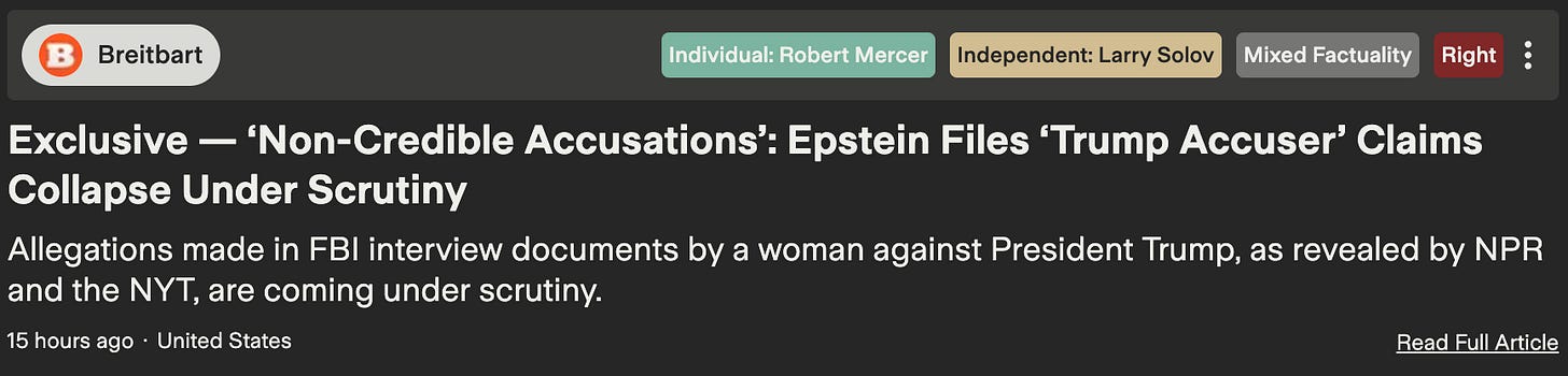 I’m subscribed to their Vantage plan, which includes the features I used when researching for this piece. It’s been invaluable in helping me to understand the media landscape and quantify how the biggest developments are covered. It also tells you who funds each media organization, so you can make an informed decision about which companies you’re supporting.