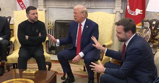 You’ve likely seen the footage by now, so I won’t litigate it in its entirety here, but I did want to note that the first 30 or so minutes of the Oval Office meeting were mostly calm. There was a signing room set up for Trump and Zelenskyy to sign the rare mineral deal afterward. Lunch was awaiting them. There was a scheduled press conference. Then, Vice President J.D. Vance decided to escalate the situation.